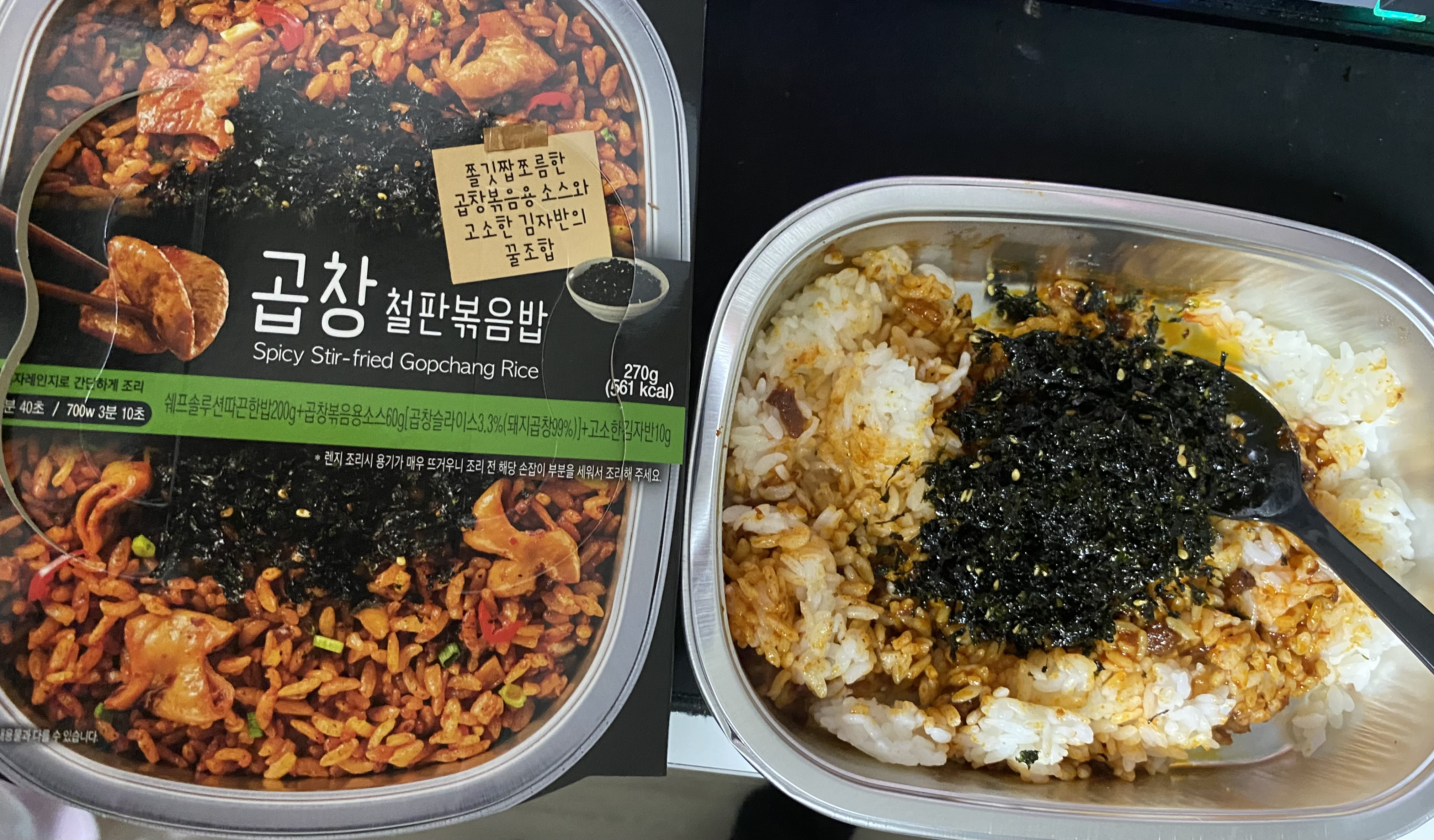 자취생들이 그러하듯 나 역시도 한 끼를 편의점 음식으로 먹는 건 일상인데, 오 곱창 철판볶음밥? 먹어봐야지 하고 샀는데 세상에 이건 소비자 고발감 아니냐? 곱창이 어딨는데...? 저 그림이랑 똑같은 건 김자반 밖에 없어..