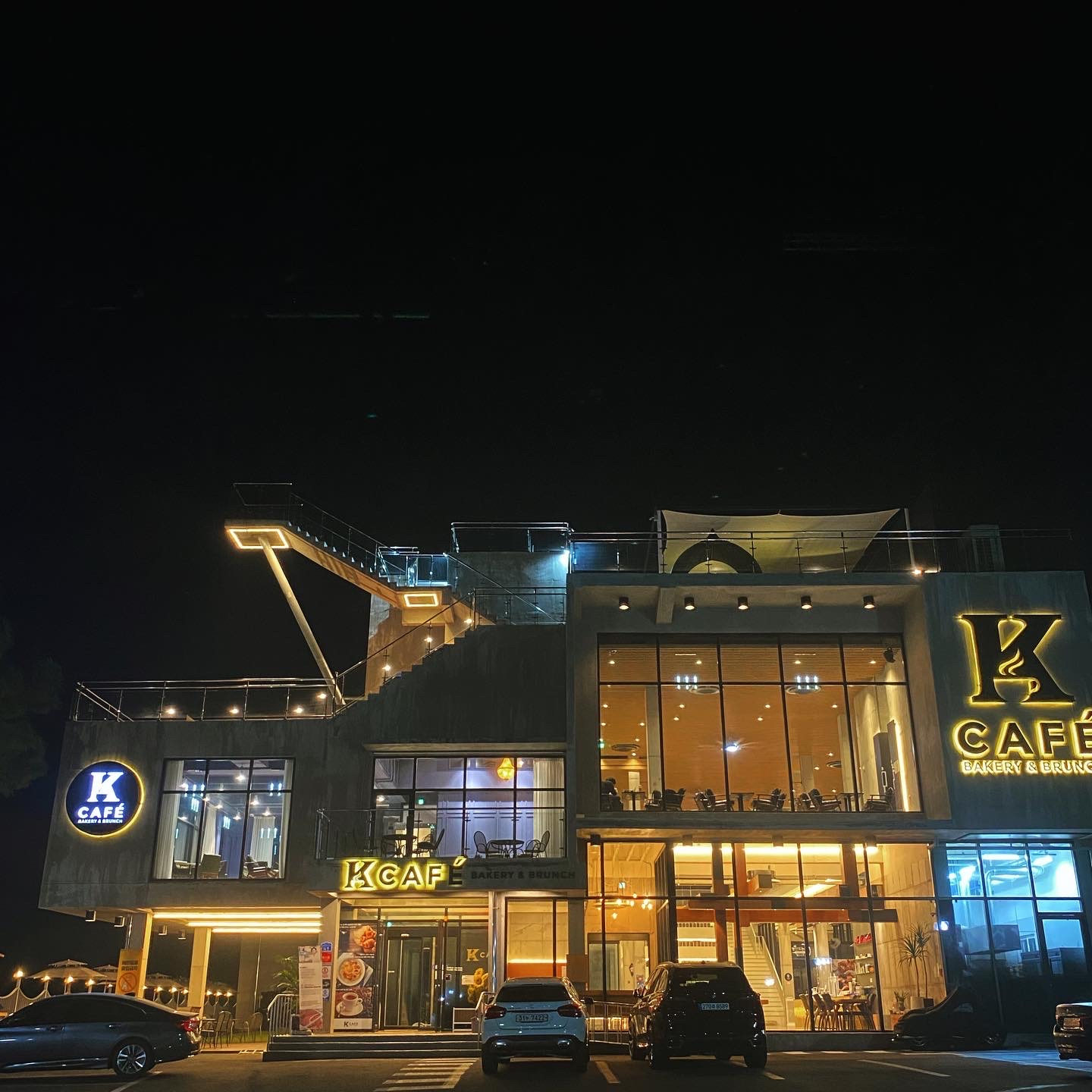 이 카페 이름은 '케이카페' ! 조명이 예뻐서 밤에 가면 더 좋고 루프탑까지 3층 정도로 크기가 매우 크다. 저번에 먹었던 기억으로는 파스타는 별로였고, 캬라멜 마끼아또가 맛있다.